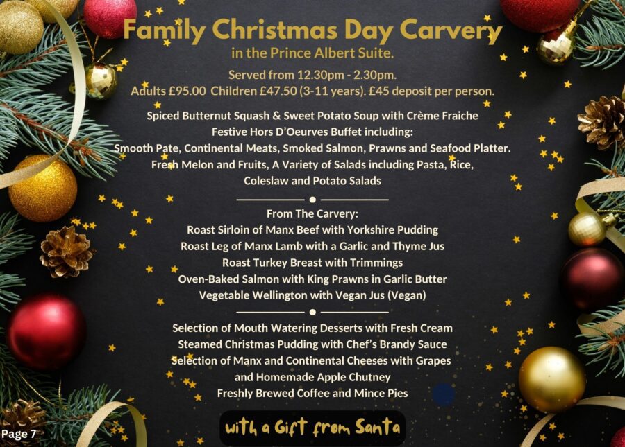 A Mouth-Watering Selection of Desserts with Fresh Cream – Steamed Christmas Pudding with Chef’s Brandy Sauce – Selection of Manx & Continental Cheese Selection with Grapes and Homemade Apple Chutney