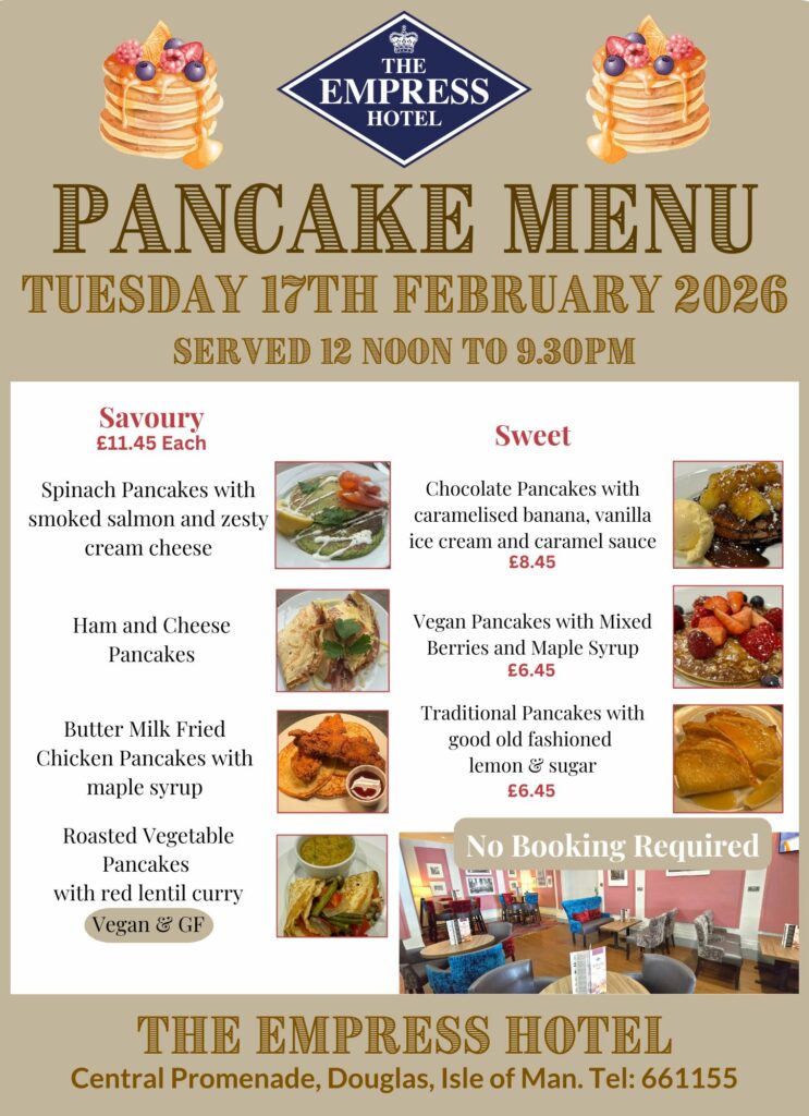 It’s here again! Our amazing Pancake Day with some great alternatives to choose from. No booking is required and served in the Piano Bar from 12 noon to 9.30pm or in the Brasserie Restaurant from 6-9.30pm