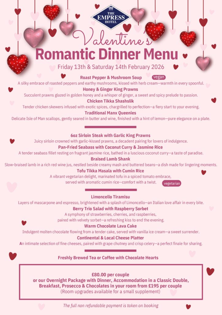 Enjoy a fantastic Valentines Dinner in the Brasserie Restaurant for just £40.00 per person on Friday 13th or Saturday 14th February 2026.